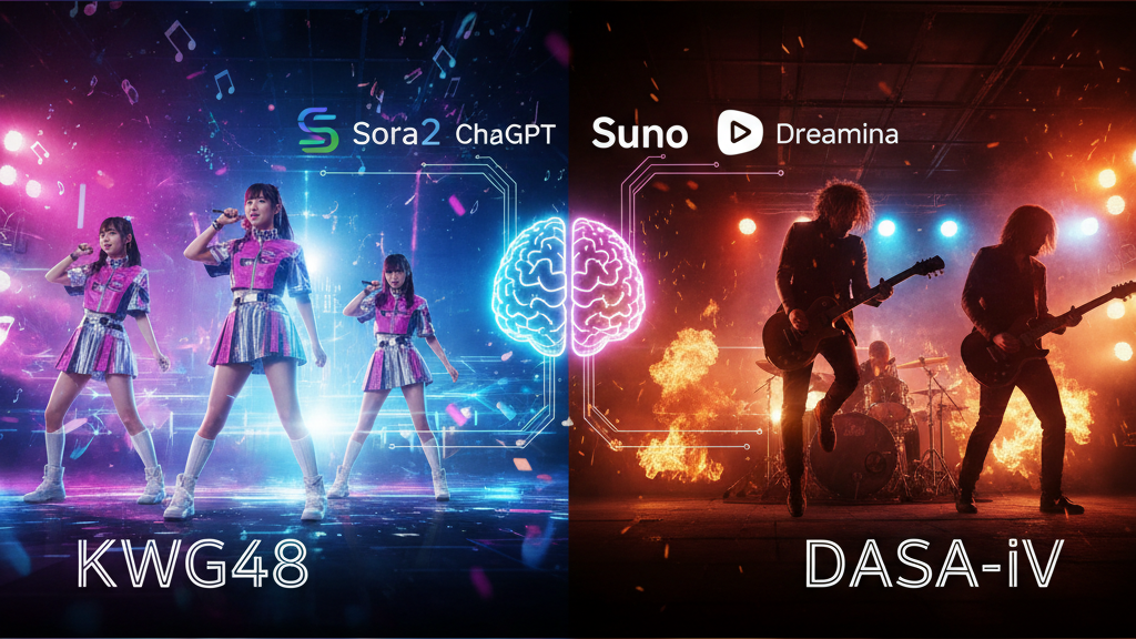 近年、目覚ましい進化を遂げる生成AIは、私たちの創造活動に革新をもたらしています。私はこの技術を活用し、架空のアイドルグループ(例:KWG48)や男性ロックバンド(例:DASA-iⅤ)をゼロから生み出し、その楽曲やミュージックビデオ(MV)、さらにはメンバーのVLOGまでを制作し、YouTubeで発信しています。